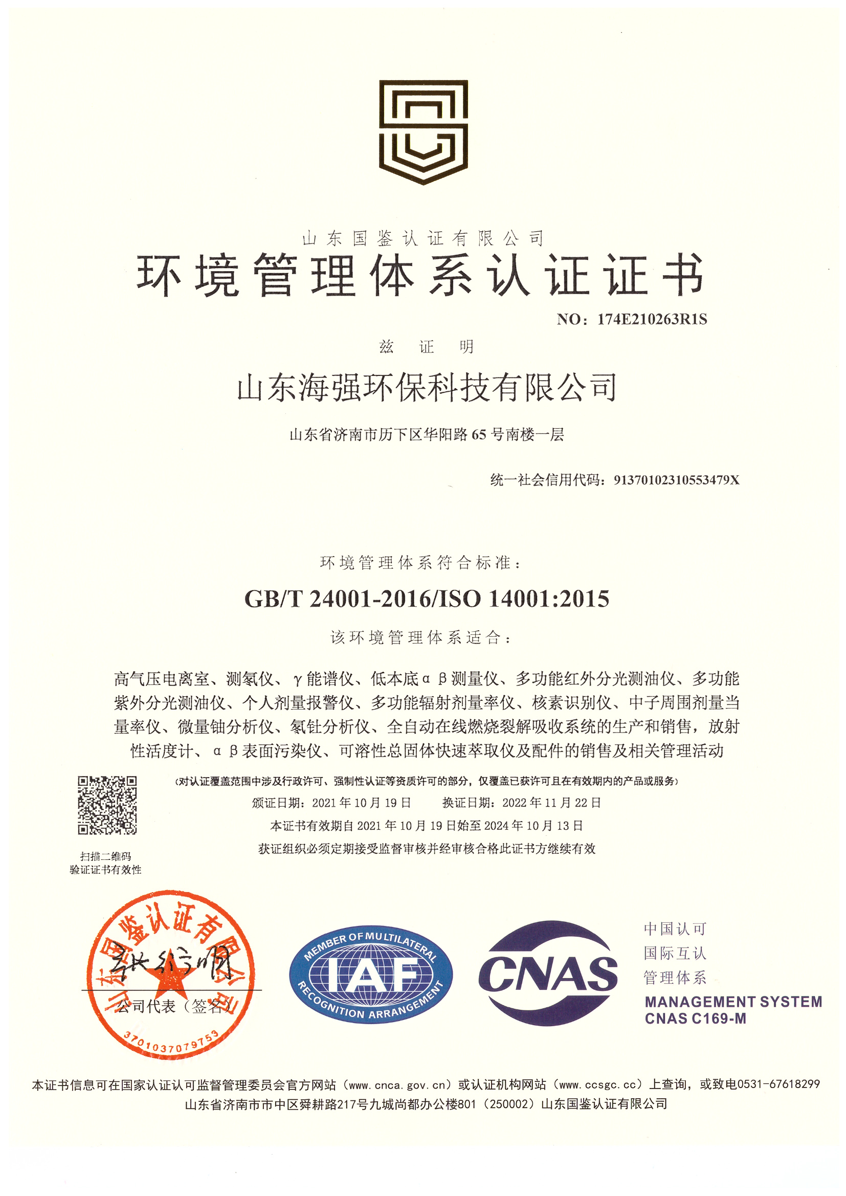 環境管理體系認證證書